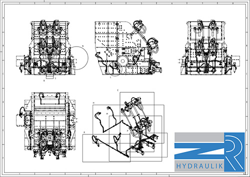 Nach Fertigstellung wird die Maschine ausgeblendet, sodass alle hydraulischen Bauteile sichtbar werden. Dann erfolgt die Ausarbeitung einer Stückliste mit Positionsnummern. Für die zu biegenden Rohrleitungen erstellen wir noch Einzelteilzeichnungen. Jetzt kann Aufgrund der erstellten Daten das Kitting erfolgen. Rohrleitungen und Schlauchleitungen werden von uns Angefertigt und entsprechend gekennzeichnet. Alle Verbraucher ( z.B. Zylinder, Steuerblöcke ) werden montiert und geprüft. Verschraubungen, Schlauchschellen usw. werden ebenfalls mit Artikel – und Positionsnummer gekennzeichnet und verpackt.